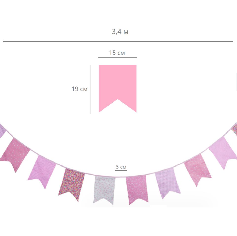 Гирлянда состоит из 12 флажков, общая длина составляет 3,4 м, расстояние между флажками 3 см, длина матерчатых флажков 2,1 м, длина лямок с обеих сторон по 50 см
