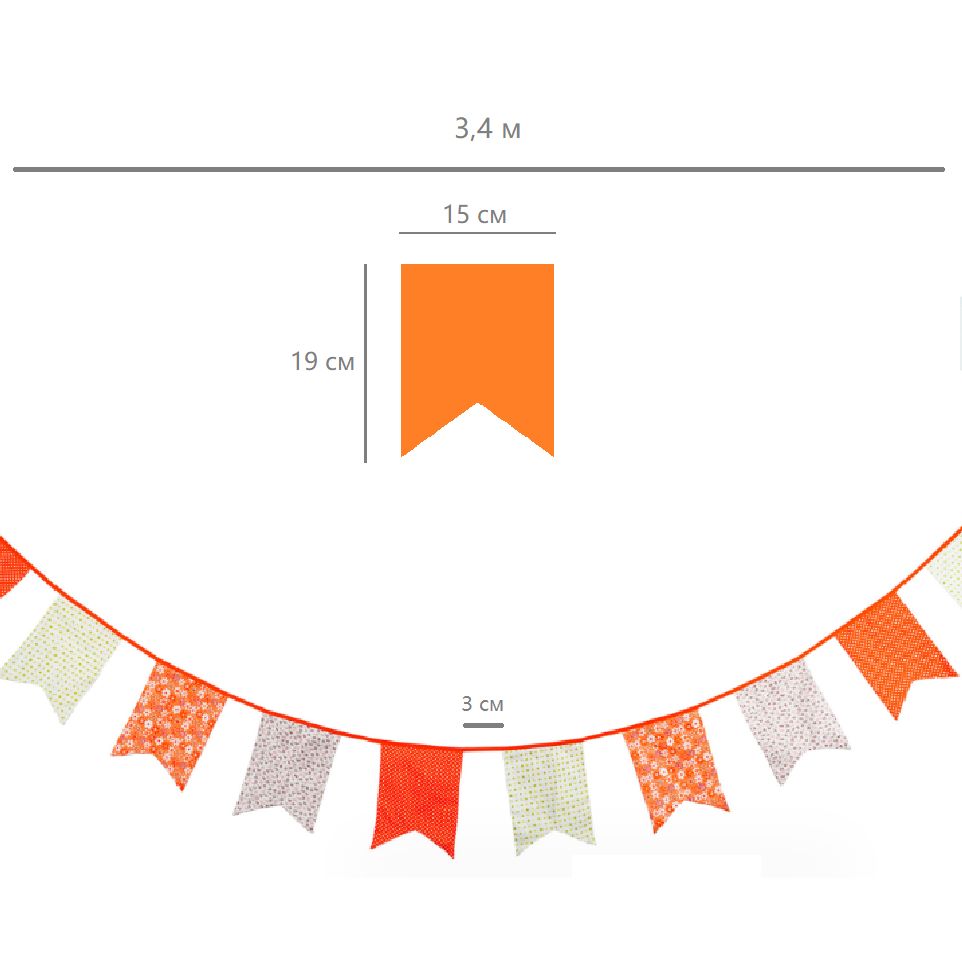 Гирлянда состоит из 12 флажков, общая длина составляет 3,4 м, расстояние между флажками 3 см, длина матерчатых флажков 2,1 м, длина лямок с обеих сторон по 50 см