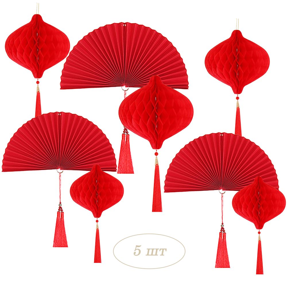 Набор украшений для праздника №72 включает пять шаров-сот и три веера-гармошки.