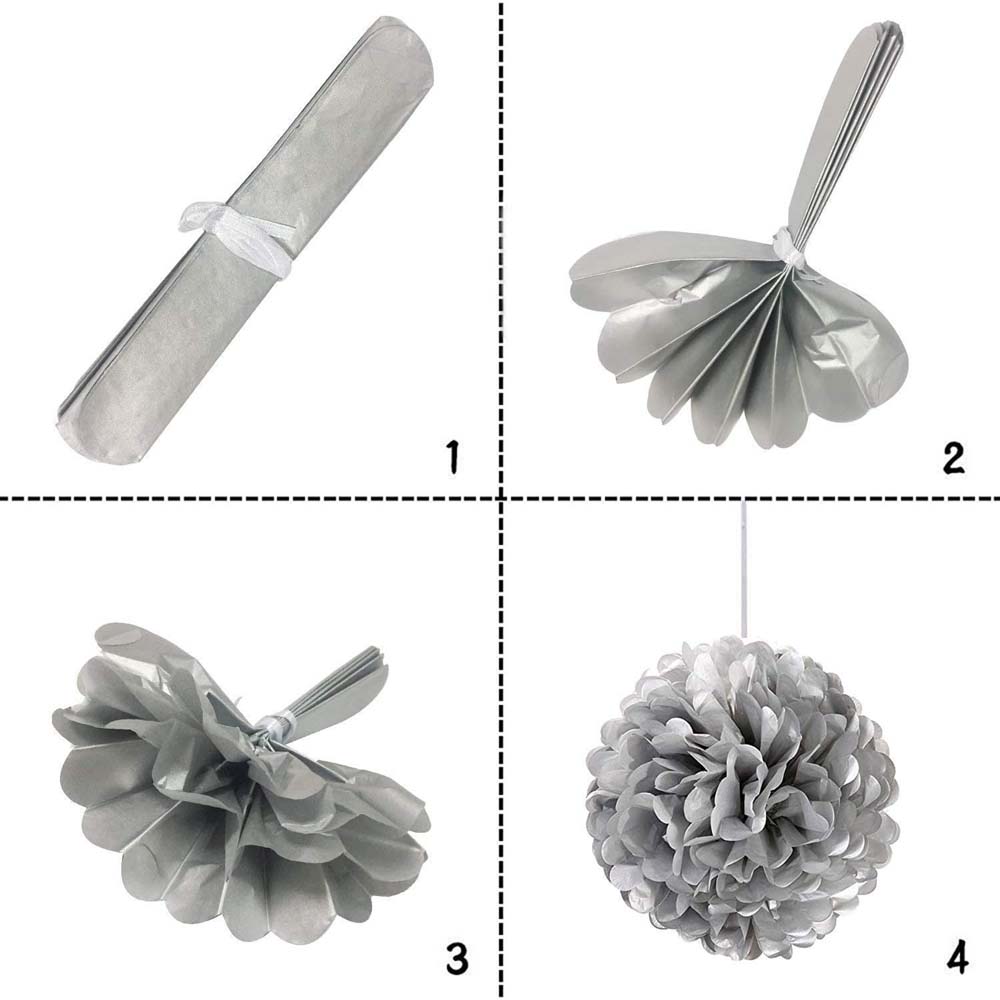 Серебряный бумажный помпон диаметром 30 см — стильное и лёгкое украшение для праздников, фотозон, витрин и интерьера. Отлично подойдёт для дней рождений, свадеб, вечеринок и тематических мероприятий.